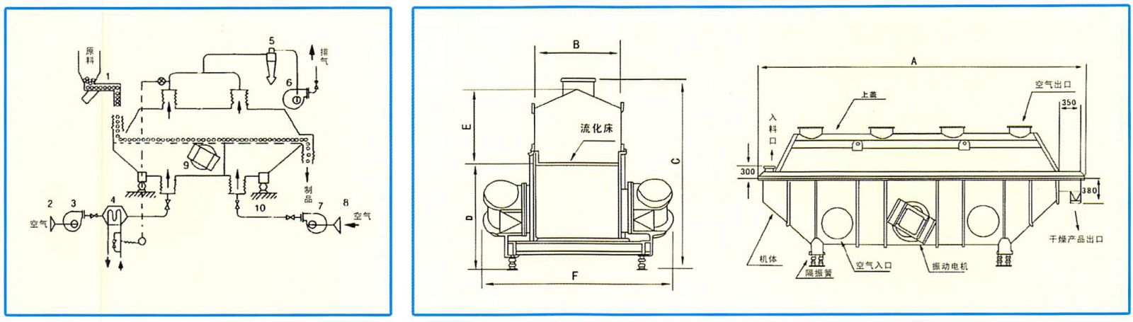 ※ 物料自進(jìn)料口進(jìn)入機(jī)內(nèi),在振動(dòng)力作用下,物料沿水平方向拋擲向前連續(xù)運(yùn)動(dòng),熱風(fēng)向上穿過流化床同濕物料換熱后,濕空氣經(jīng)旋風(fēng)分離器除塵后由排風(fēng)口排出,干燥物料由排料口排出。